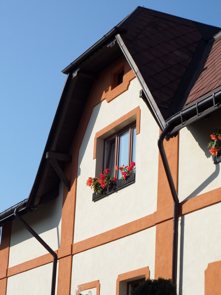 Revitalizace obvodového pláště RD Požadavkem investora bylo zachovat vzhled okrasných prvků, jež výrazně vynikly díky skvěle voleným barvám tenkovrstvé omítky.