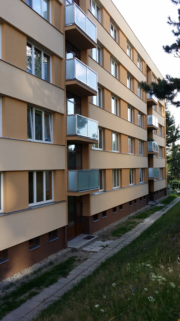 Panelový dům s částečným podzemním podsklepením a čtyřmi nadzemními podlaží. Provedena rekonstrukce lodžii s výměnou novým hliníkovým zábradlím a zateplením z polystyrenu EPS F 140mm. Fasáda silikonová zatíraná se zrnem K 2,0mm. Sokl panelového domu je zateplen se zapuštěním pod úroveň terénu z polystyrenem XPS tl. 120mm s mozaikovou omítkou.